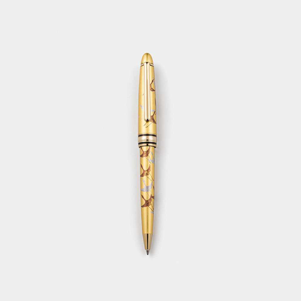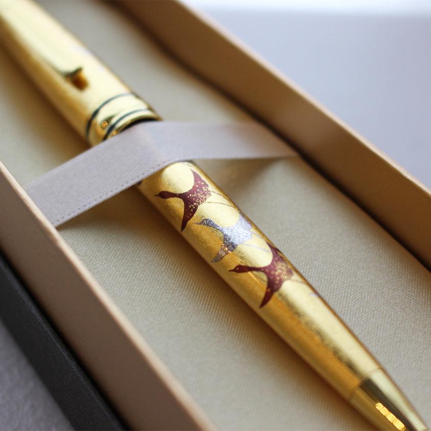 金沢箔の本金箔を贅沢にあしらったボールペン。本物の金箔ならではの、内側から放たれるような上品な輝きが特徴です。ボールペンの本体部分には、空に向かって羽ばたく鶴が描かれていて、とても華やかな印象です。