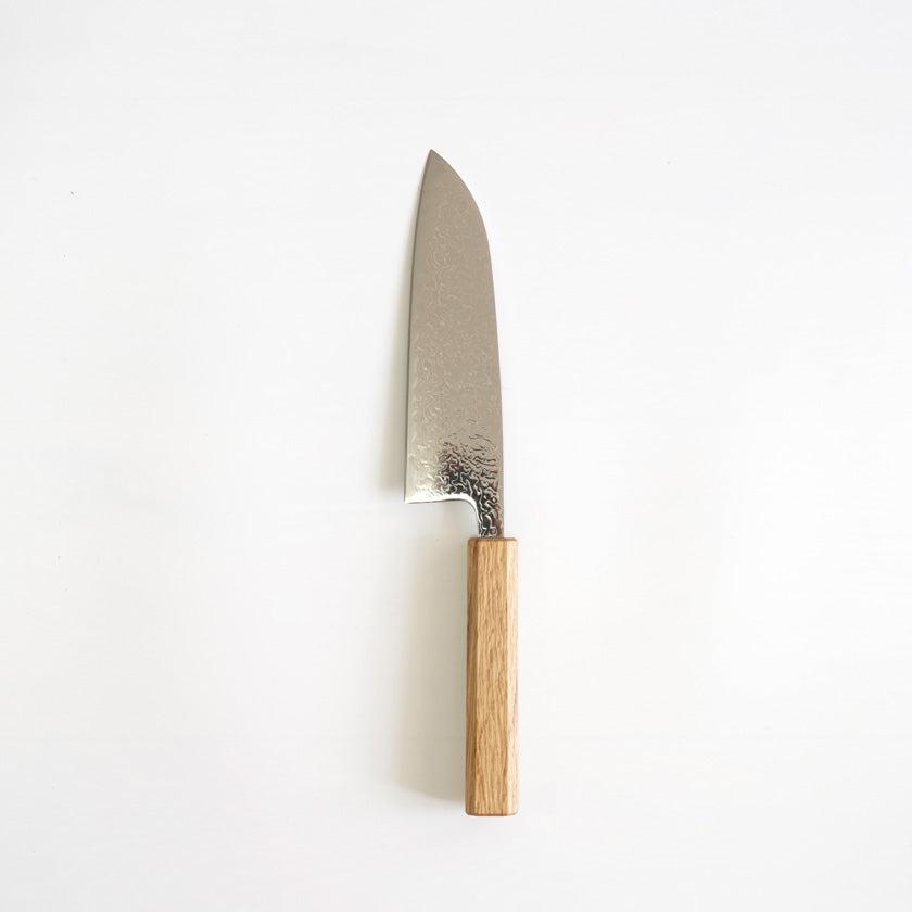 刃にはプロも愛用する鋼材V金10号を採用し、柄には刃との重量バランスを鑑み樫の天然木を採用することで "握りやすく、切りやすい" 使いやすさを追求した三徳包丁となりました。