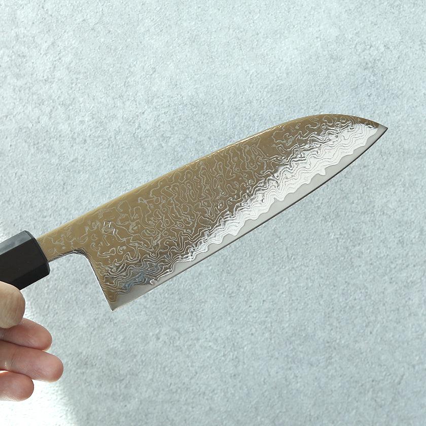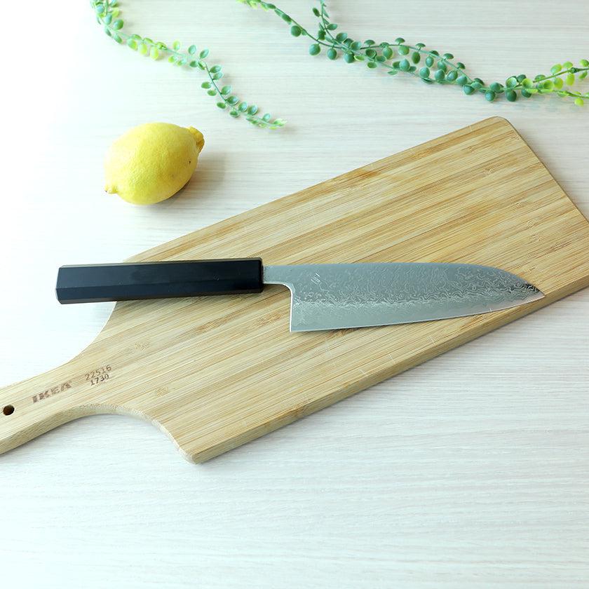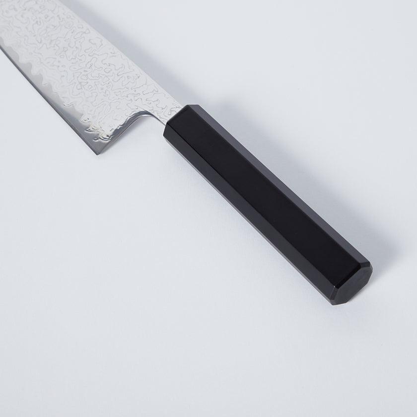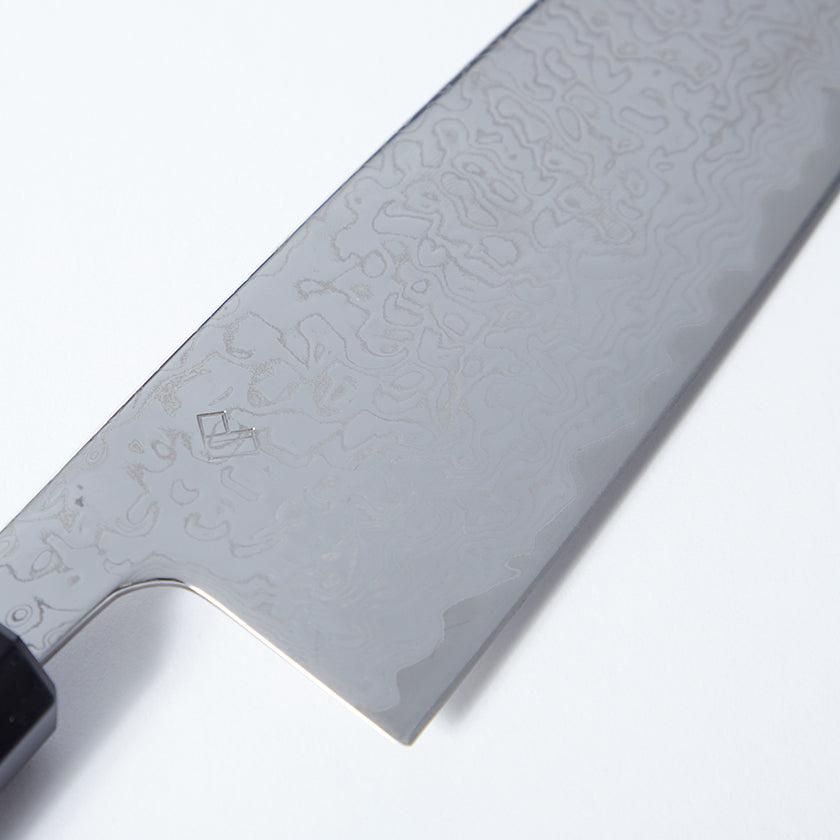 刃は切れ味が鋭く、強靭で長持ちするプロ愛用の鋼材V金10号を採用し、31層の槌目状のダマスカス模様が目に美しい逸品。