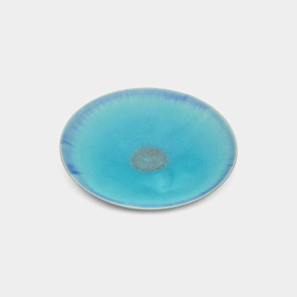 中心部で結晶化した釉薬の溜まり部分も見所の一つ、突き抜けるような青色の変化をお楽しみください。