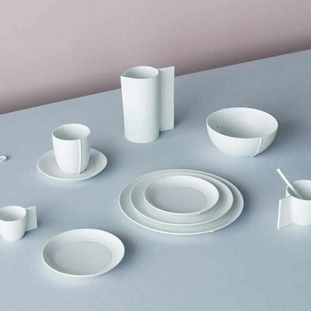 リネン生地を使って、コップ、皿やボウルの形状のモデルを作り、それを磁器へと再構築したデザインは、通常の釉薬を使用したシリーズと、2016/を制作する10の窯元で廃棄する磁器材料が混ぜ込まれた釉薬を利用した、特別な有田焼コレクションがあります。