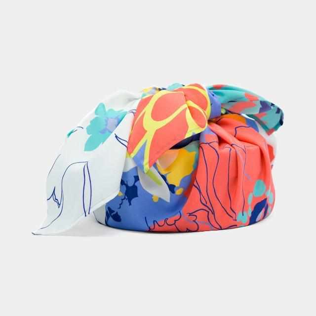 たくさんの和の花が風呂敷いっぱいに配置され、華やかでポップな印象のデザイン。使い方によって見える部分が異なるため、さまざまな表情を見せてくれるのも魅力です。
