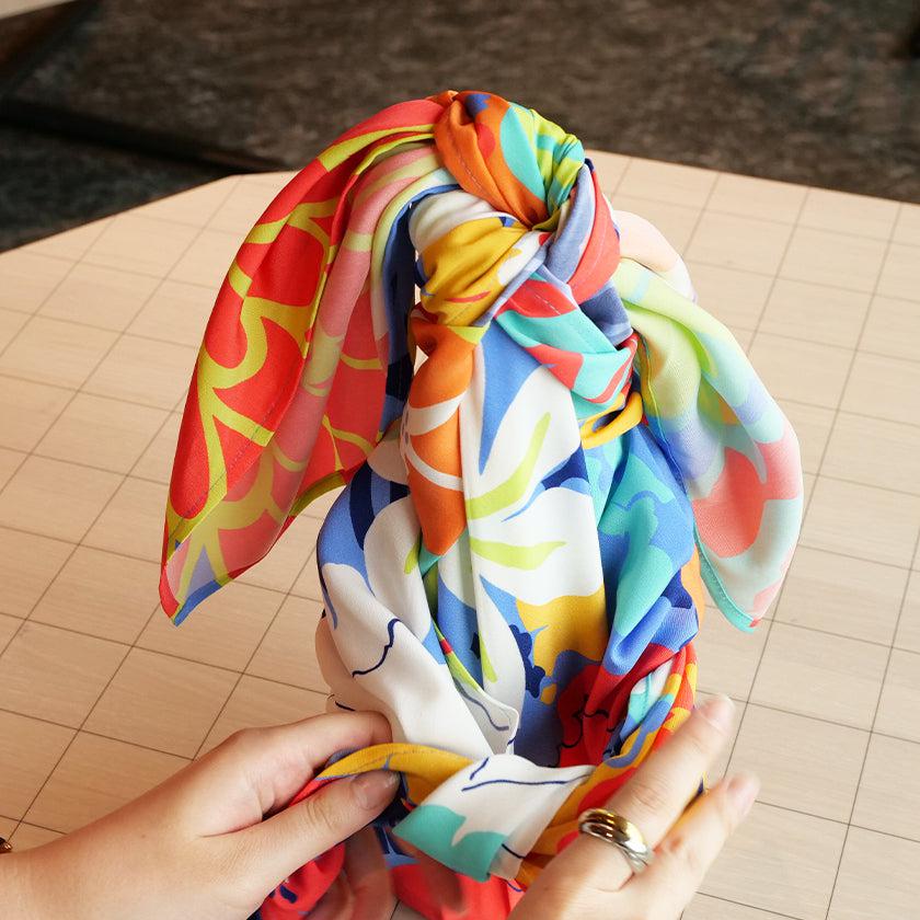 例えば、急な買い物でスーパーに行った時には、四隅をくくるだけでエコバックに。突然の雨で傘を持っていないときには、さっとかぶれば傘がわりに。