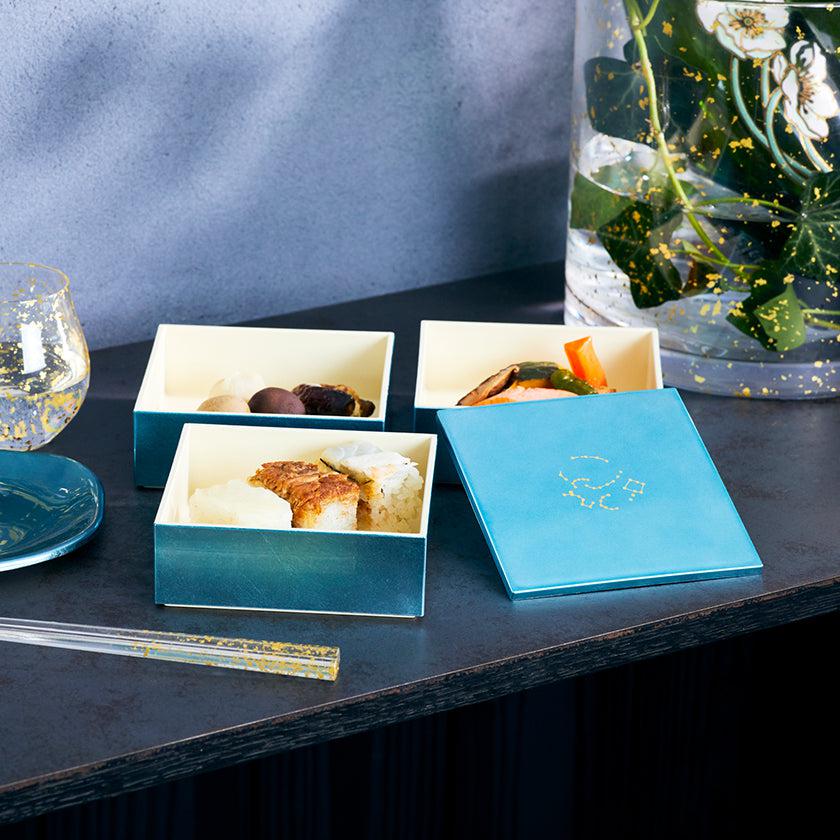 丈夫で扱いやすい樹脂製の重箱は、金沢21世紀美術館の代表的な作品の1つであるプールに映る星座をイメージした水色で、内側は中身を際立たせるマットホワイトで仕上げました。