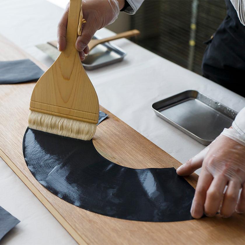 膠(にかわ)と礬水(どうさ)で金箔を貼り付ける伝統技法に、現代の感覚を取り入れたデザインが特徴です。