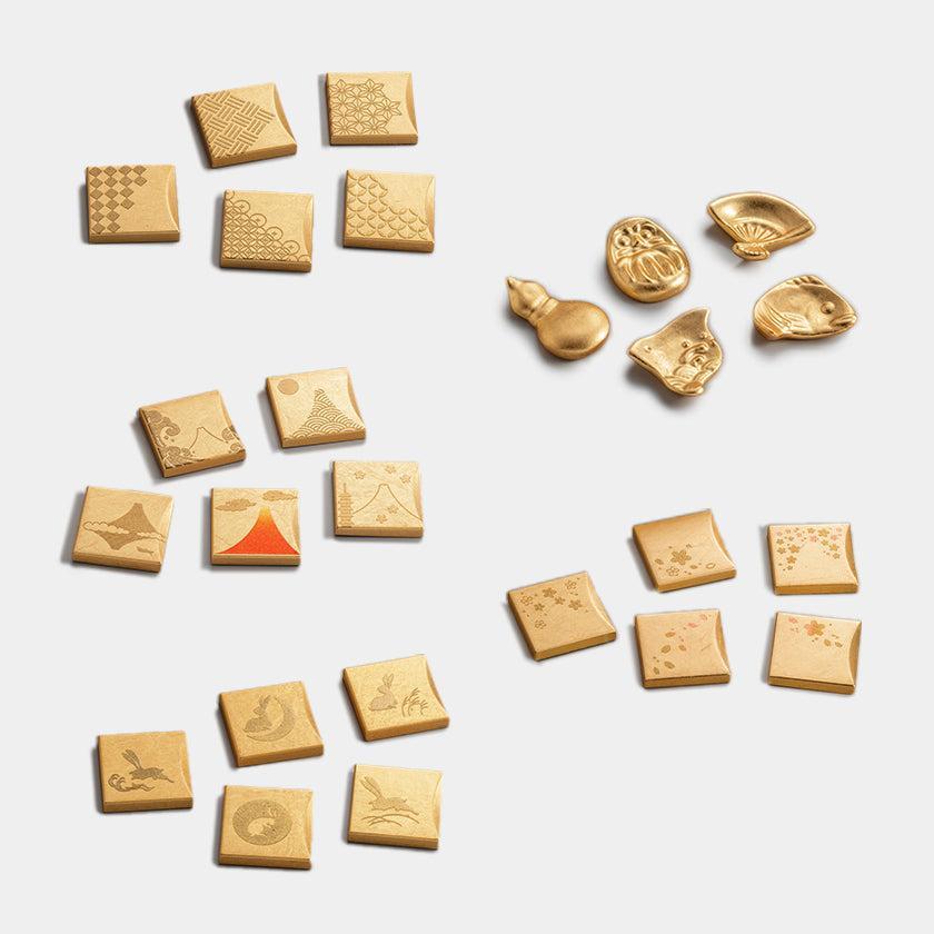 | サイズ (cm) | 五つ小紋、富士五景、桜オノマトペ、うさぎ: W3.8 * D3.8 * H0.7 縁起もの: W5.0 * D5.0 *H 1.0 ~ 1.4 |