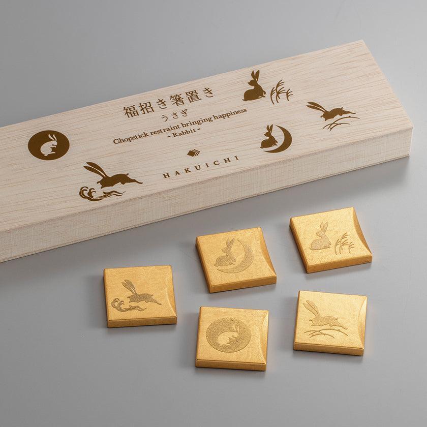 シンプルな金ベースに盛り上げ技法で絵柄を施した箸置きセットです。