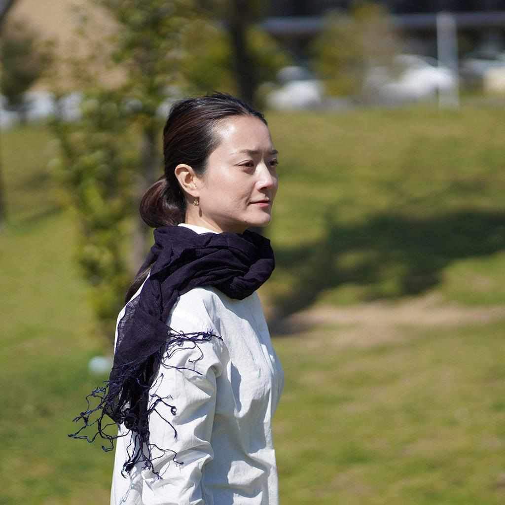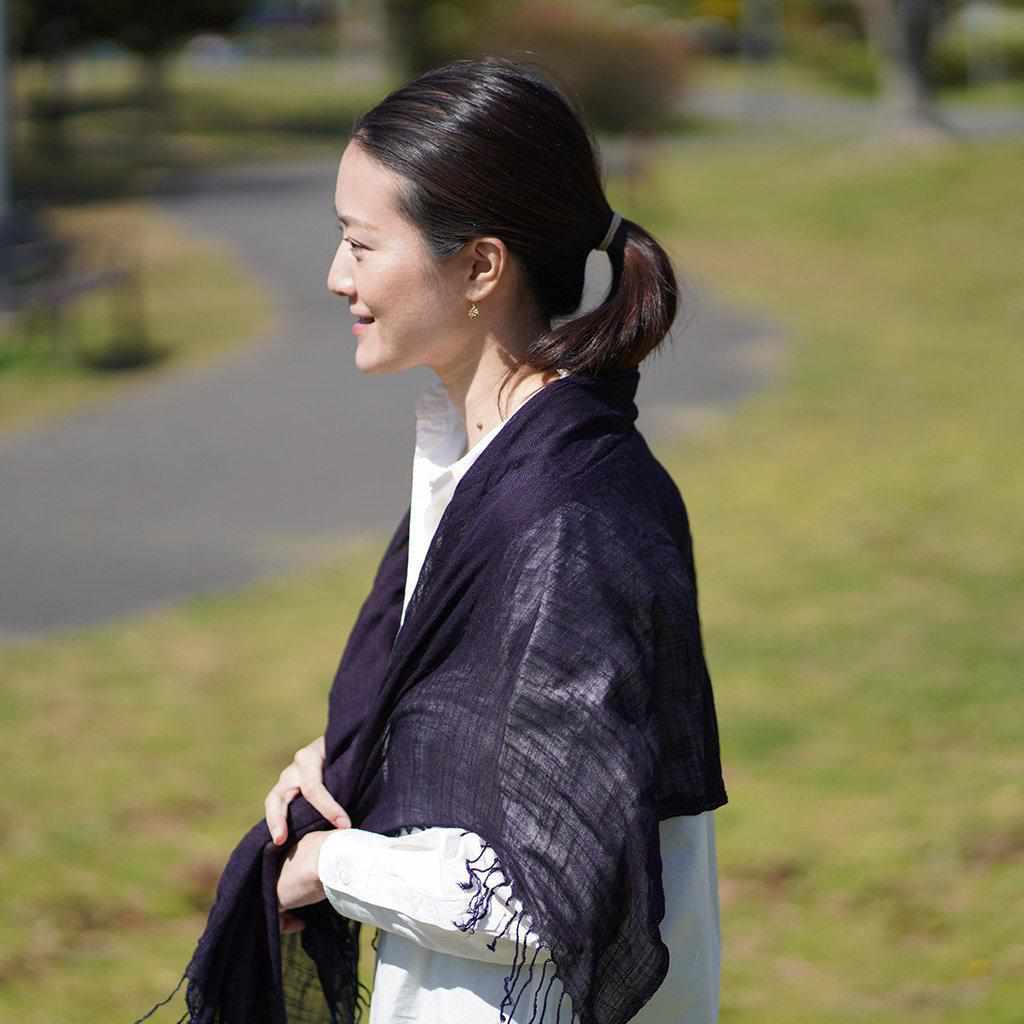 7回染めのストールは、重ね染めに手間と時間を要するアイテム。ブランドの中でも「特濃色」として最も濃く仕上げられています。3回染めのストールと並べてみると、その濃さがよくわかります。生地を広げれば光が透けて軽やかになり、重なりが生まれると藍の力強さを感じます。落ち着いた印象ですが、光によって色の見え方が異なるのも趣深いですね。