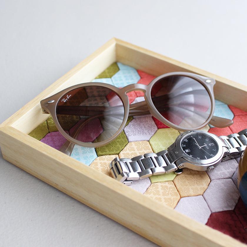 節句人形の技術を活かしたアクセサリートレイ。色とりどりの生絹が、木目込みの技術によって美しく整列する姿は見惚れてしまうほど。程よいクッション性があり、大切なジュエリーなども安心して置くことができます。大きめサイズなので、腕時計など毎日使うものを収納するトレイとしても役立ちますよ。