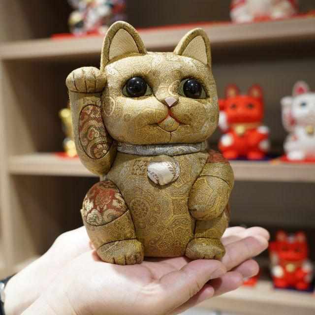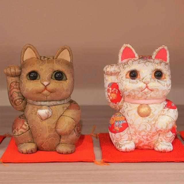 伝統工芸士の柿沼東光が従来の木目込み人形にはなかった素材を取り入れることで、一段と可愛らしく愛嬌のある招き猫が出来上がりました。