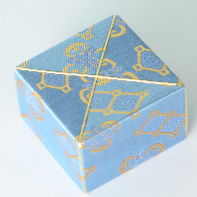 伝統的な雛人形にも使われる土台に筋を入れて布が動かないようにする“木目込み(きめこみ)”という技法を用いて作った指輪ケースです。