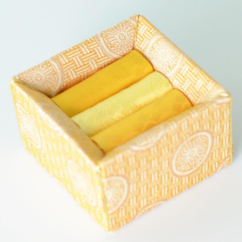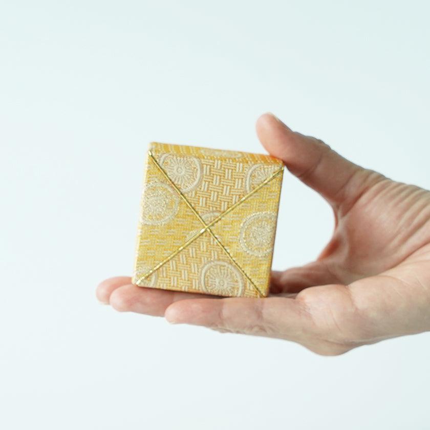 伝統的な雛人形にも使われる土台に筋を入れて布が動かないようにする“木目込み(きめこみ)”という技法を用いて作った指輪ケースです。