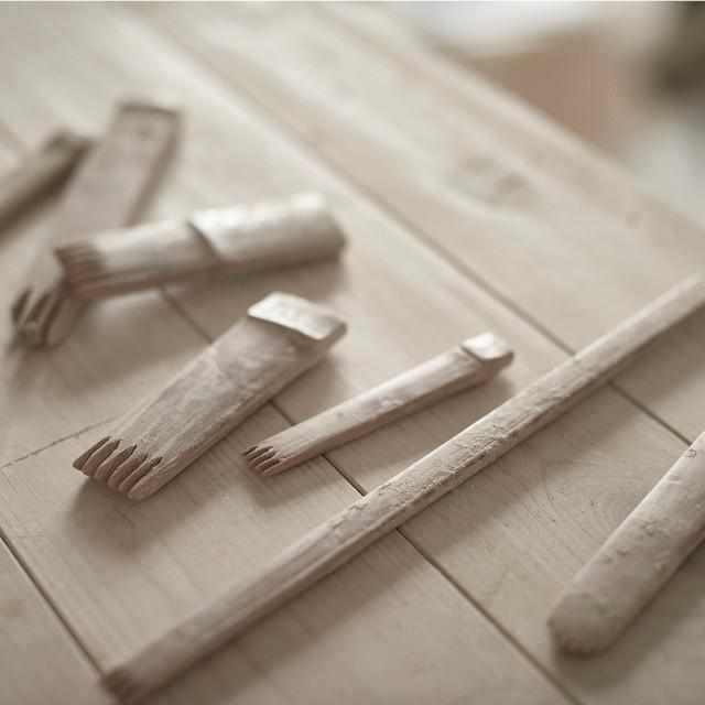 数ある道具の中でも、仕上げに欠かせない「金ベラ」 への愛着は強い。長い間使用していると微妙な歪み を感じるほど繊細なもので、仕上がりへの影響も大 きいという。身体の一部のようにメンテナンスを怠 ることはない。