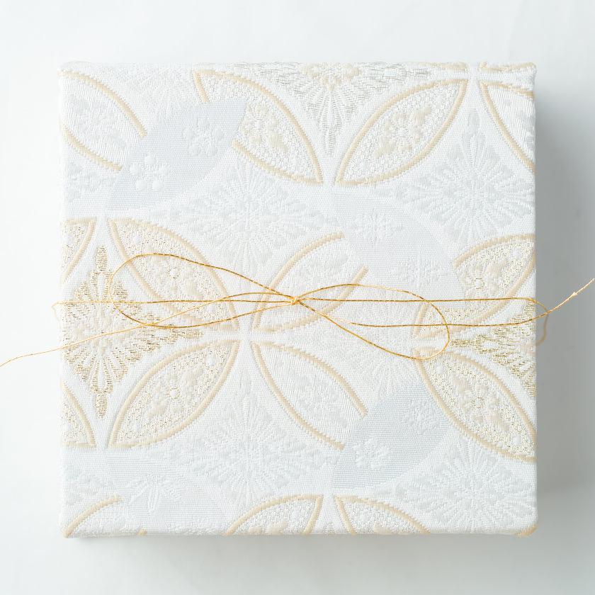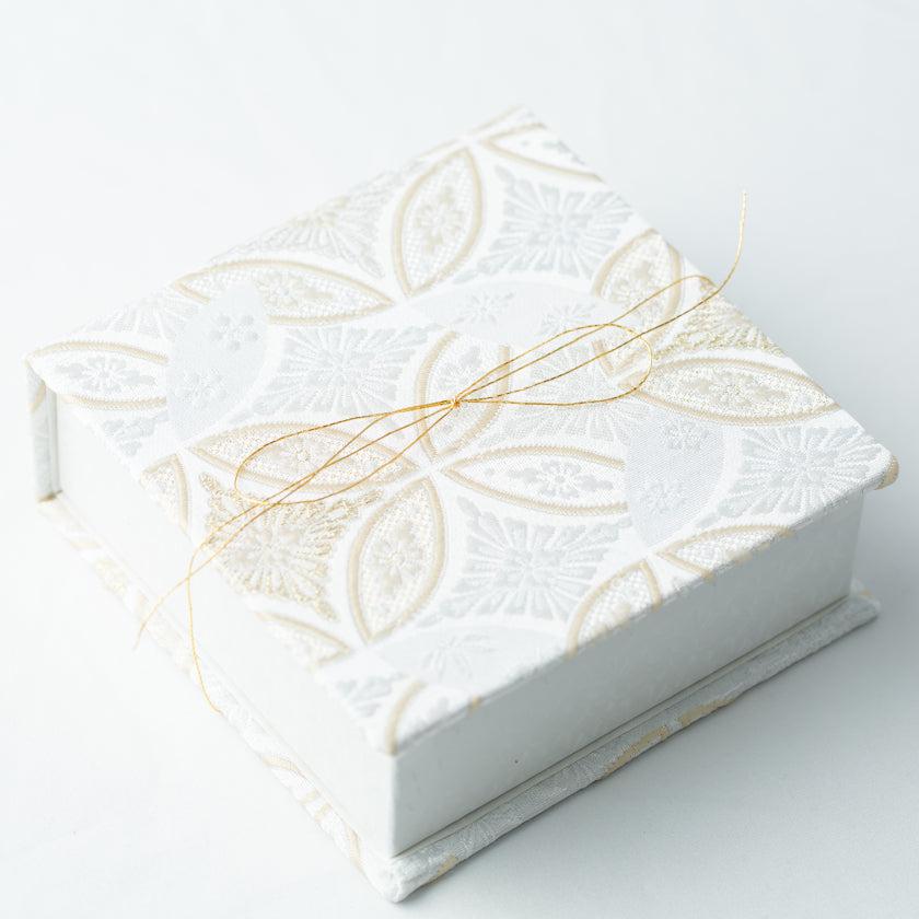 ひとくちサイズのフィナンシェが4つ入った西陣織のジュエリーボックスです。