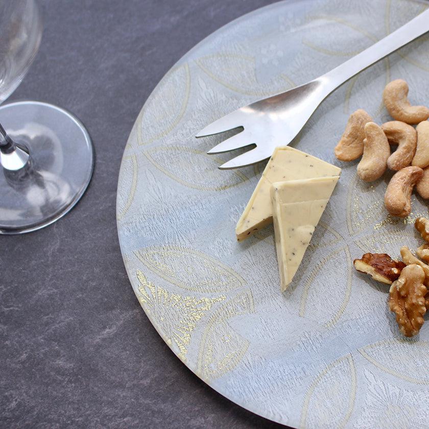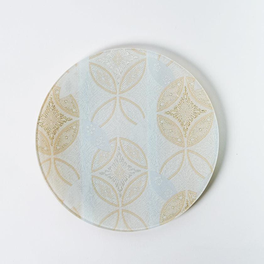 西陣織工業組合に認定された西陣織に特殊なガラスコーティングを施したお皿で、七宝の華は、古くから縁起の良い柄として日本に伝わっています。