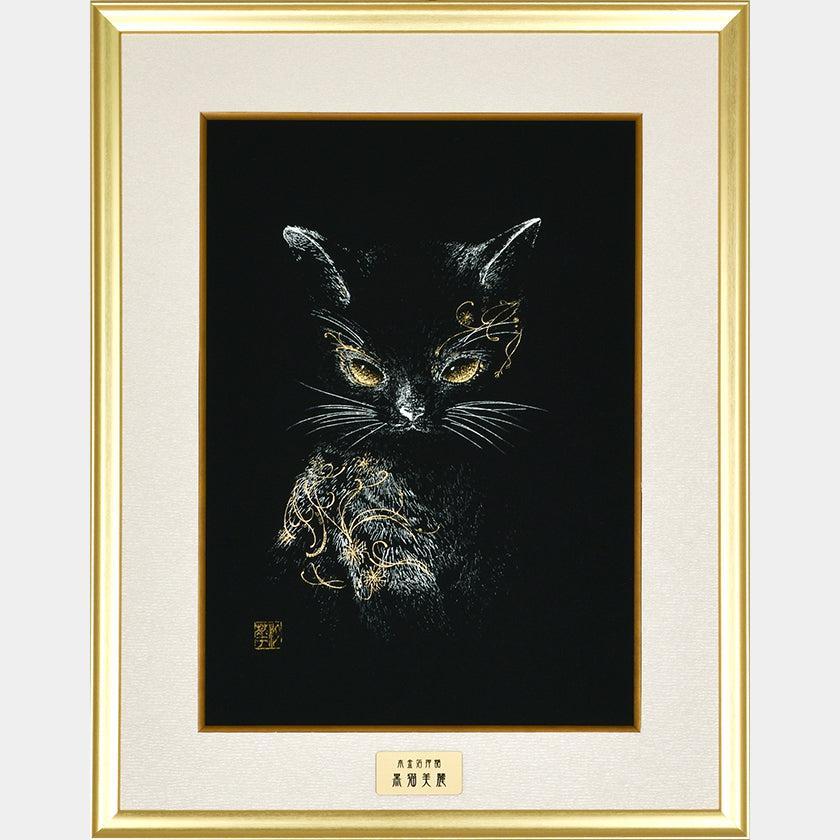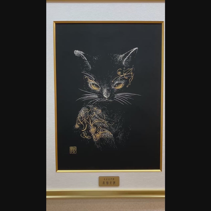 妖艶な黒猫をイメージし、本金箔とアルミ銀箔で箔押しを施し、さらに繊細な手彩で仕上げた上質な一作です。