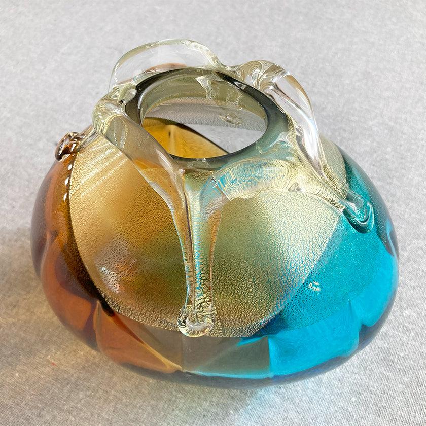 使われているガラスはたった2色ですが、花瓶の向きや角度によってふたつのカラーと上部の金色に輝く部分が絶妙に混ざりあうため、美しい色彩を楽しむことができます。ガラスの透明性がこの花瓶に奥深さと美しい表情を与えてくれていると言えますね。