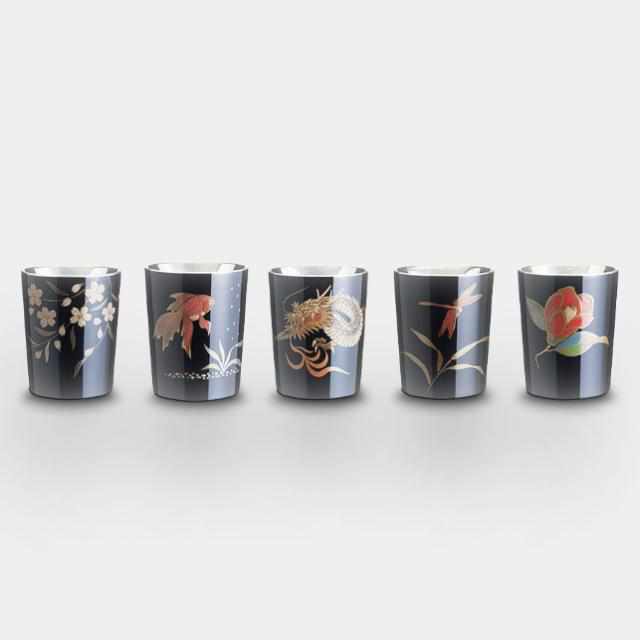 【カップ5点セット】輪島仕上げ 上燗コップ 三杯一合 黒 (桜・椿・金魚・トンボ・龍) | 大阪浪華錫器