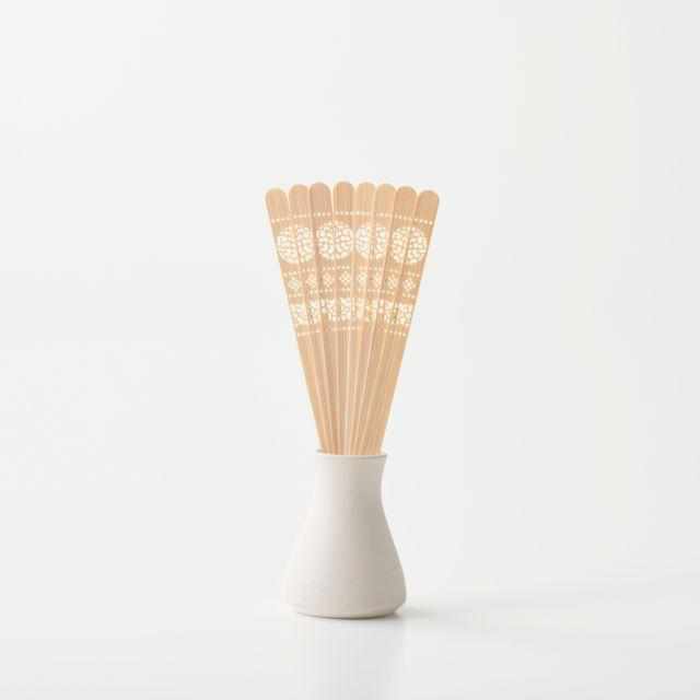 扇子用に薄く加工された竹の扇骨は吸水性と保水性に優れ、一度まとった香りを保ち続けます。この扇骨の特性を活かし、お部屋に香りを導く優美なリードスティックに仕立てています。