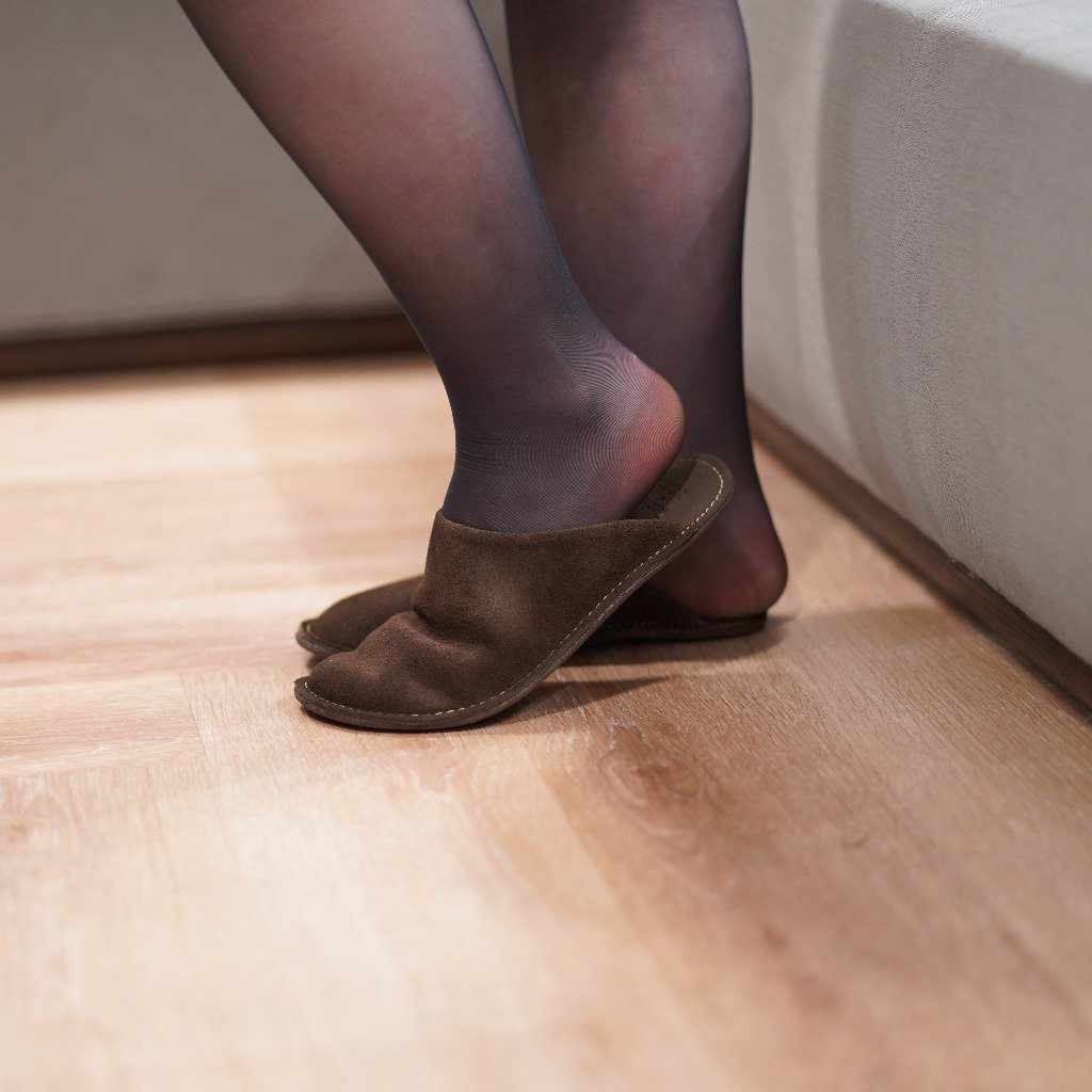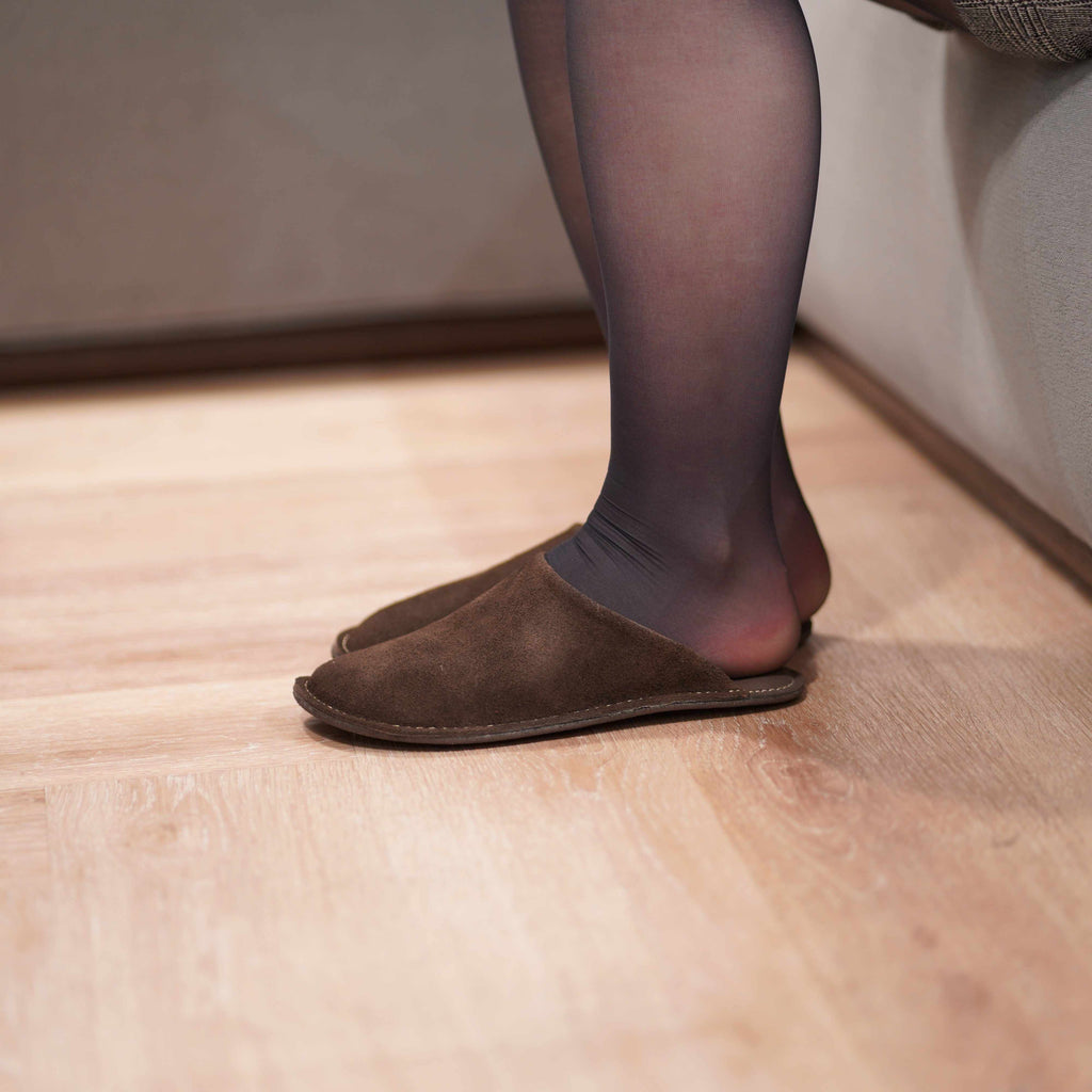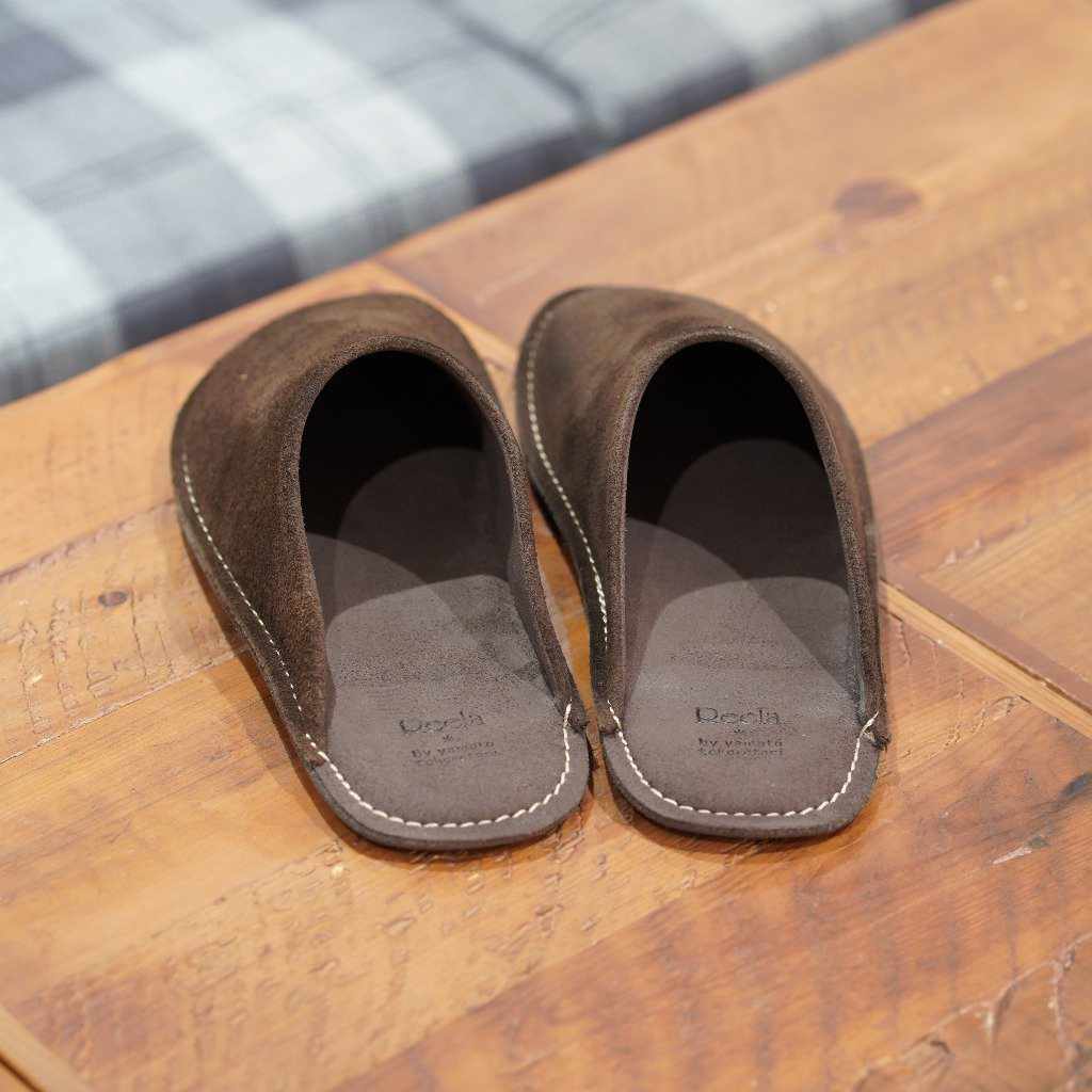 和歌山産のトコ革(天然皮革)の多彩な起毛がプレーンで柔らかな装いのルームサボ(スリッパ)です。