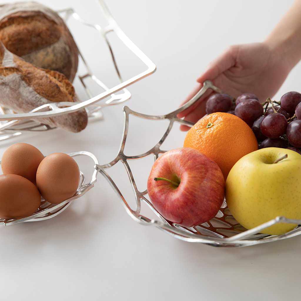 キッチンやリビングのカウンターに置いてフルーツを入れたり、玄関において財布やキーなど雑多になりやすい必需品を入れたり。平らにしてインテリアマットや花瓶台として使ったり、来客時に個包装のお菓子を入れたり。