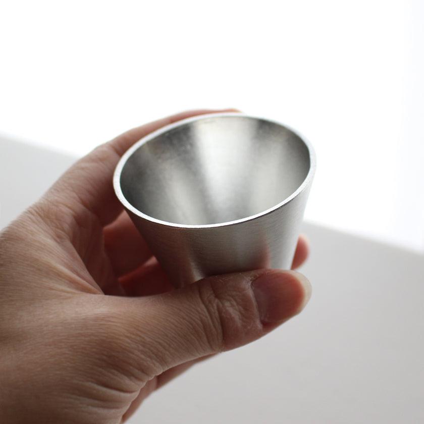ぐい呑みの容量は60ml。一般的なぐい呑みの容量と同様です。ひとつあたりの重さは約80g前後と、陶器やガラスなどのぐい呑みと比べるとしっかりとした重量感があります。サイズは高さ約5.1cm、飲み口の直径は約5.7cm。底から飲み口にかけて適度な広がりがあるため、手におさまりがよく何度も口へと運ぶのもスムーズ。