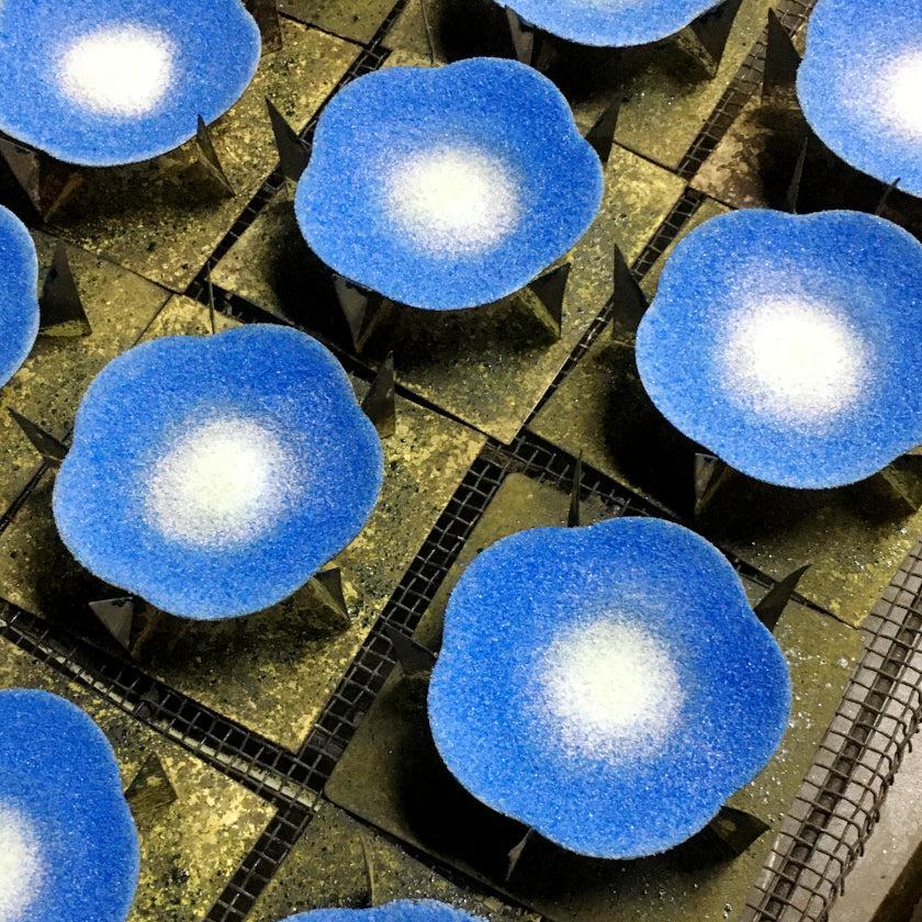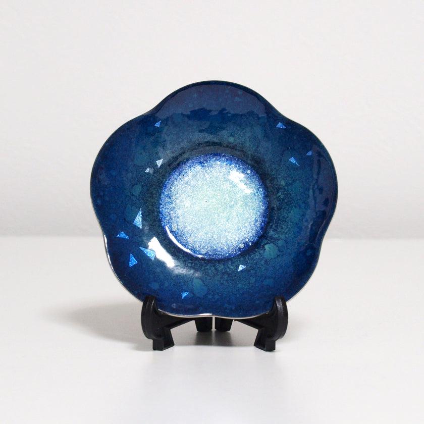 梅の花をかたどったモチーフの優しい雰囲気に、深い紺色のグラデーションが映えるペア茶托セットです。