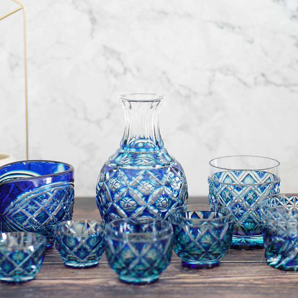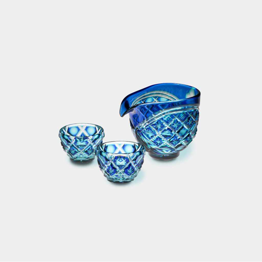 透明なクリスタルガラスに緑色、瑠璃色を2色被せて更なるグラデーションを追求したシリーズの酒器セットです。