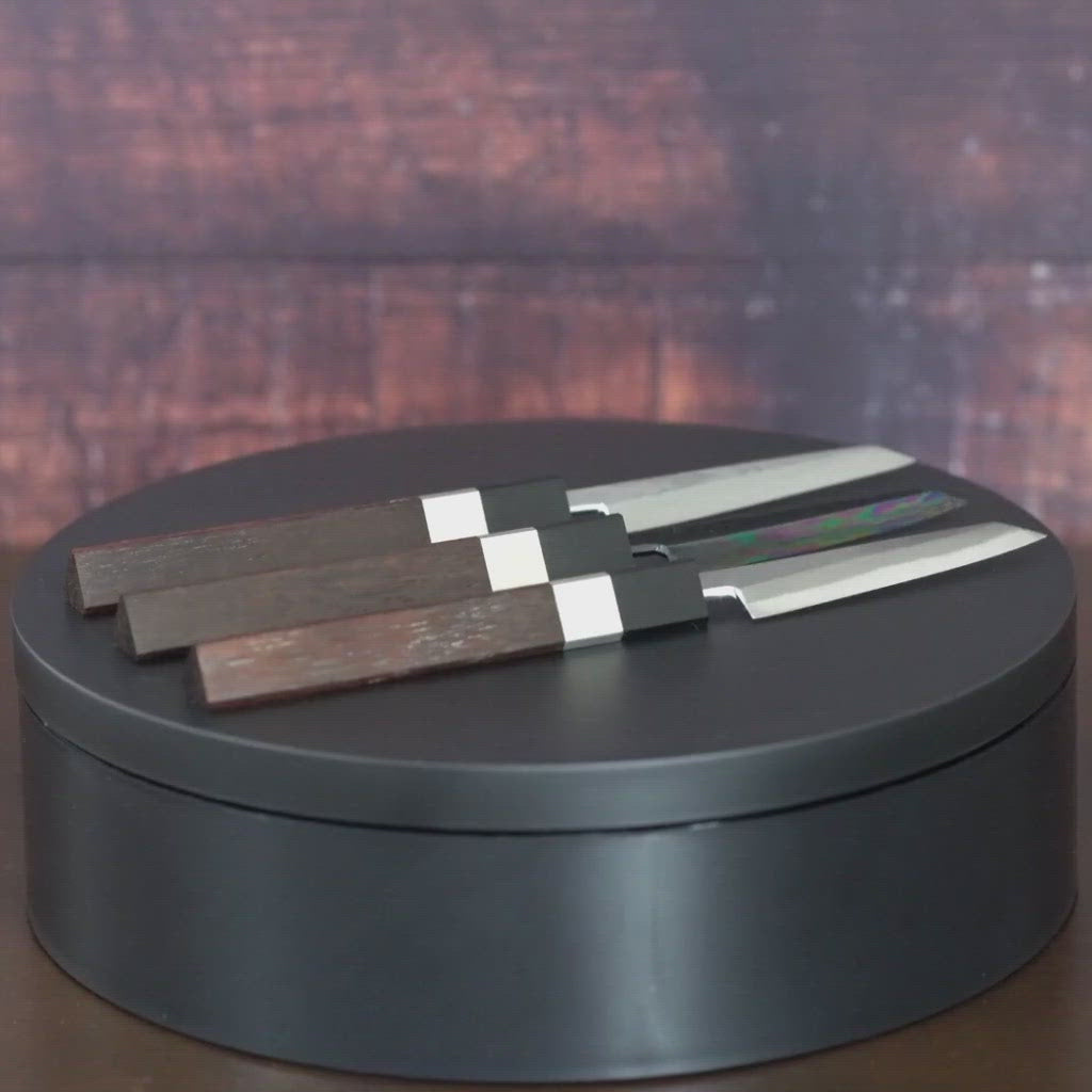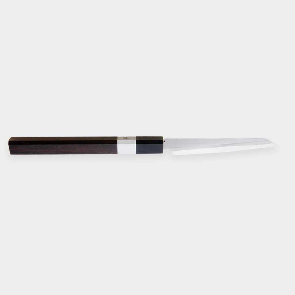 表面を鏡面に磨き黒く染めた、和包丁でも珍しい仕上げ。モダンな印象で、カッコいい雰囲気を好む方におすすめです。酸化被膜のため、錆にも強くなっています。