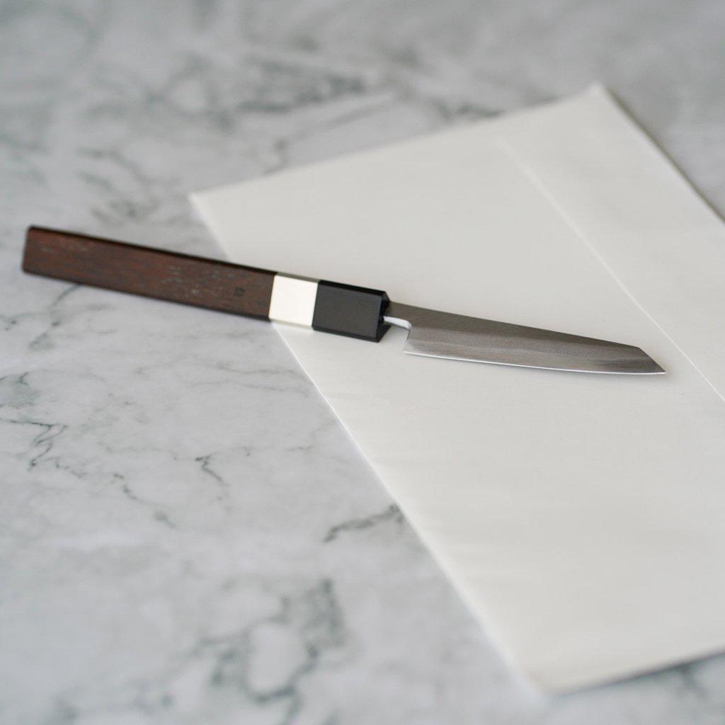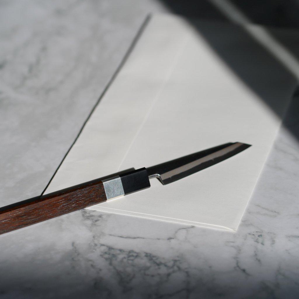 ペーパーナイフといいつつも、そのデザインはまるで小さな包丁のよう。刃のかたちは、先端が背から刃先に向けて斜めにカットされた美しい切付型。わずか1.2cmの身幅のなかに、刃金と地金を接合して鍛造されることで生まれる合わせ目もしっかりと確認できます(※ 標準仕様)。