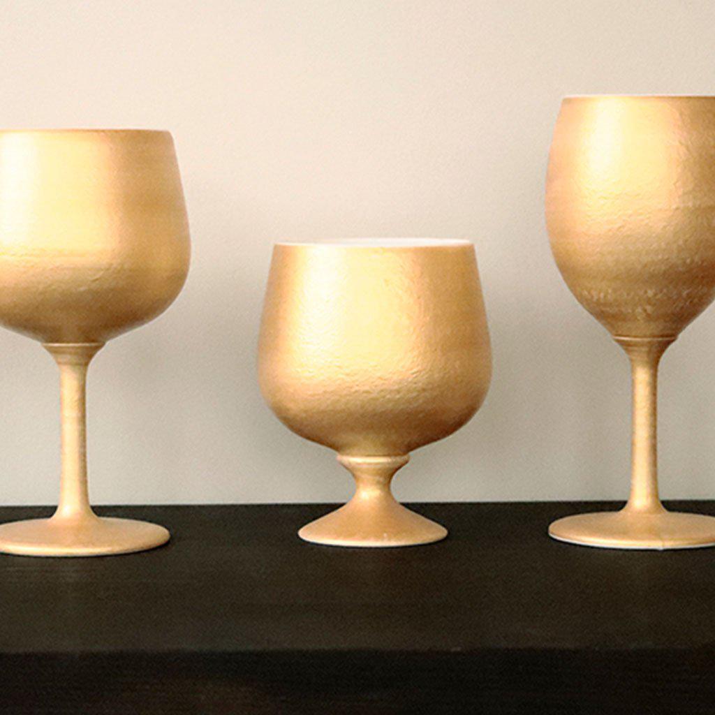深みのあるゴールドカラーが美しい磁器製のワイングラス。ショートステムタイプですがたっぷり容量です。日常使いしやすく、またホットドリンクなどにも使える汎用性の高いアイテム。ぽってりとしたフォルムもおしゃれで、こだわり派へのプレゼントにもおすすめのグラスです!