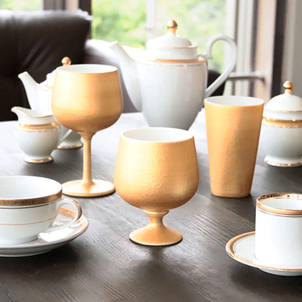 ゴールドの輝きが美しい、磁器のワイングラス。創業130年以上を誇る、美濃焼の陶磁器ブランドが手がけたグラスです。