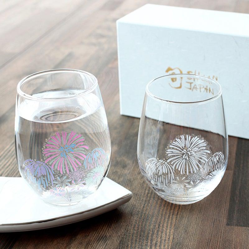 飲み物を注ぐと、描かれた絵の色が変化するグラスのセット。創業130年以上を誇る老舗の陶磁器ブランドが、長きを経て培った経験を活かして開発されました。4つのグラスにはそれぞれ桜・花火・紅葉・雪景色のデザインが施され、日本の美しい四季の移ろいを表現しています。
