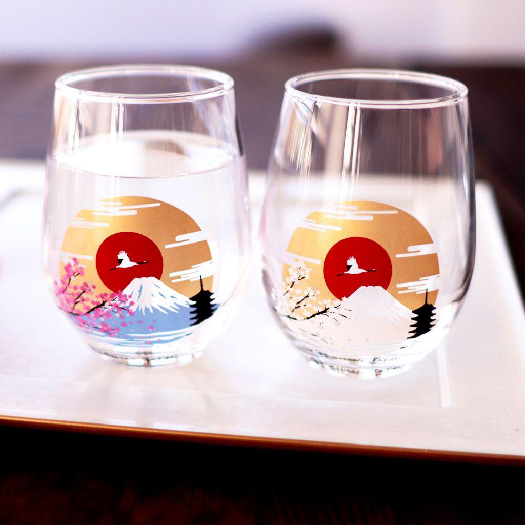 17℃以下の冷たい飲み物を入れると、白い富士山がブルーに、白い桜がピンクに色付く不思議なグラス。専用ボックス入りのペアセットで、お祝いなどのギフトにもおすすめです。しっかりとして厚みがあるため丈夫で、日常使いにぴったりですよ。