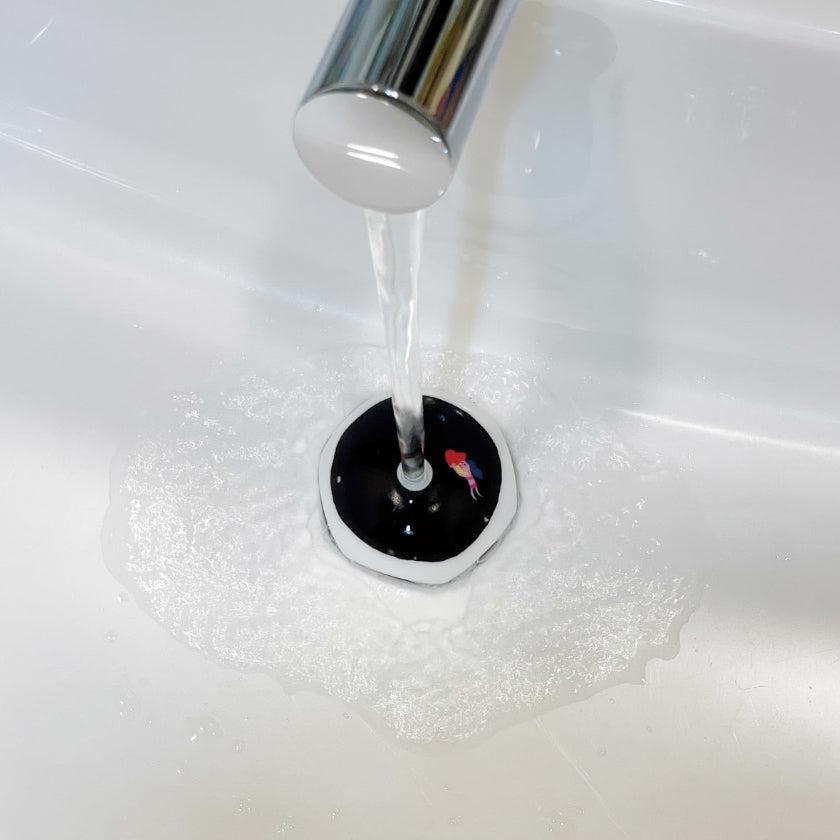 約30度のお湯がかかると、真っ黒な海から鮮やかなイルカが現れる楽しい排水口カバーです。