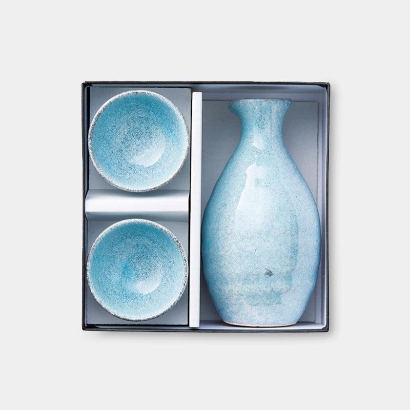 青い海、白い砂浜、打ち寄せる波。穏やかだったりダイナミックだったりとそんな情景が浮かぶような色合いの酒器セットです。