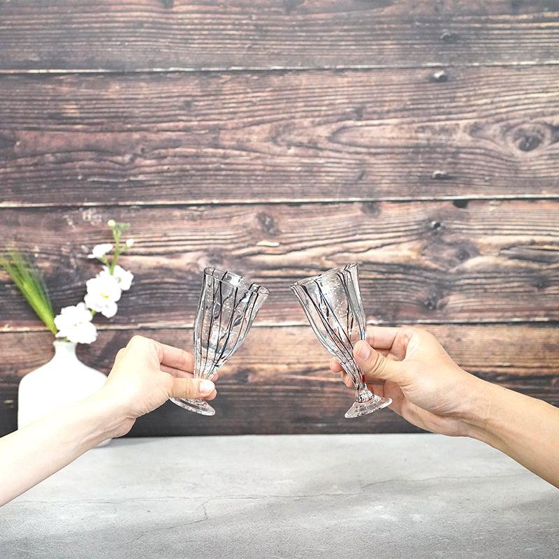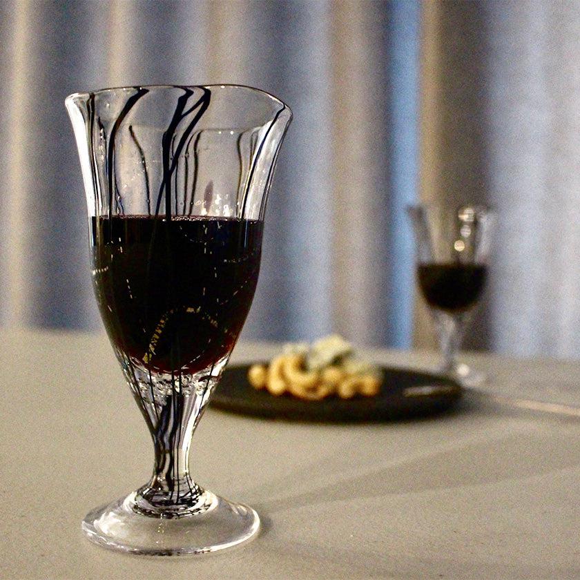 グラスには大胆なブラックのラインが全体に流れ、そのラインに絡まるように赤や青などさまざまなカラーの粒が配されています。さらには空気の泡があいまって、キラキラと輝く宝石のような美しさ。シンプルなワイングラスとはまた異なる、個性がひかるワイングラスです。