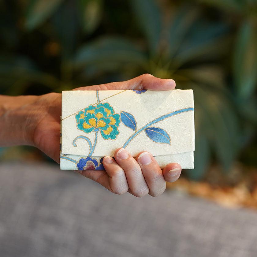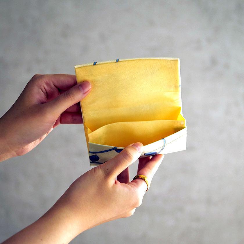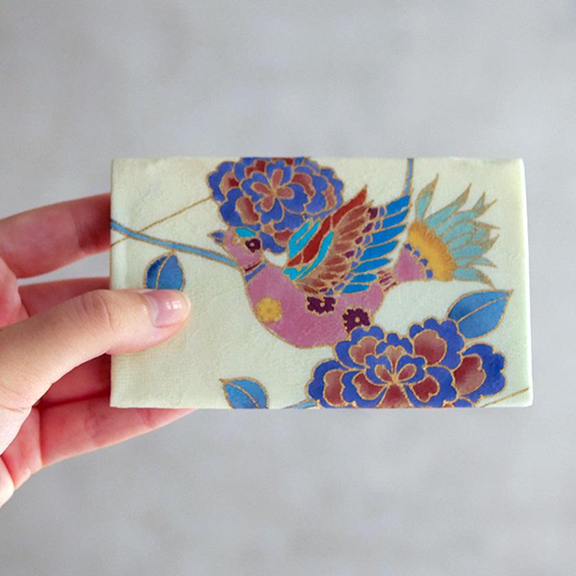 光沢の美しい丹後縮緬の生地に華やかな図案を描いた唯一無二のカードケースです。すべて手描きで着物と同じように染めています。