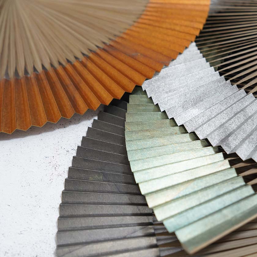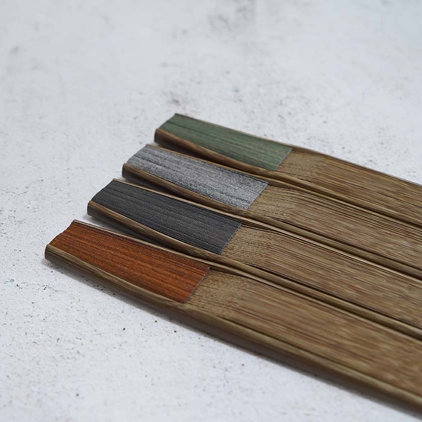 こちらの扇子は、銀箔を燻し変色する段階で出る上品な色合いの焼箔そのままの魅力を日本伝統の美意識「無常観」に重ね表現しています。独特の色味と風合いが美しい4色のカラー展開。染料を使わず銀箔の自然な色のみで構成されているにもかかわらず、これだけ色彩豊かなことにも驚きますね。