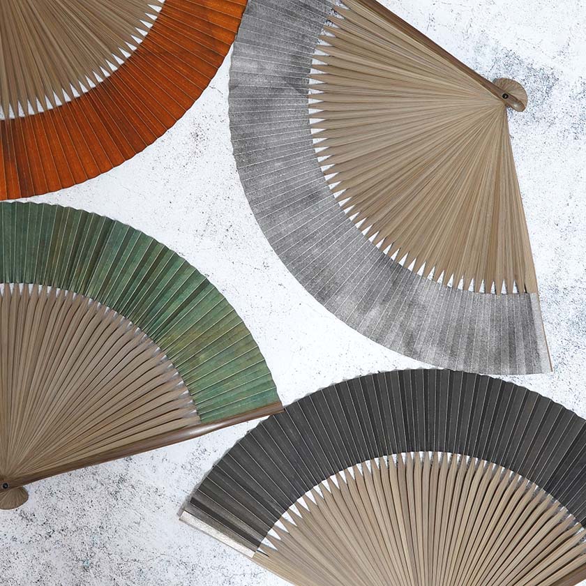 こちらの扇子は、銀箔を燻し変色する段階で出る上品な色合いの焼箔そのままの魅力を日本伝統の美意識「無常観」に重ね表現しています。独特の色味と風合いが美しい4色のカラー展開。染料を使わず銀箔の自然な色のみで構成されているにもかかわらず、これだけ色彩豊かなことにも驚きますね。