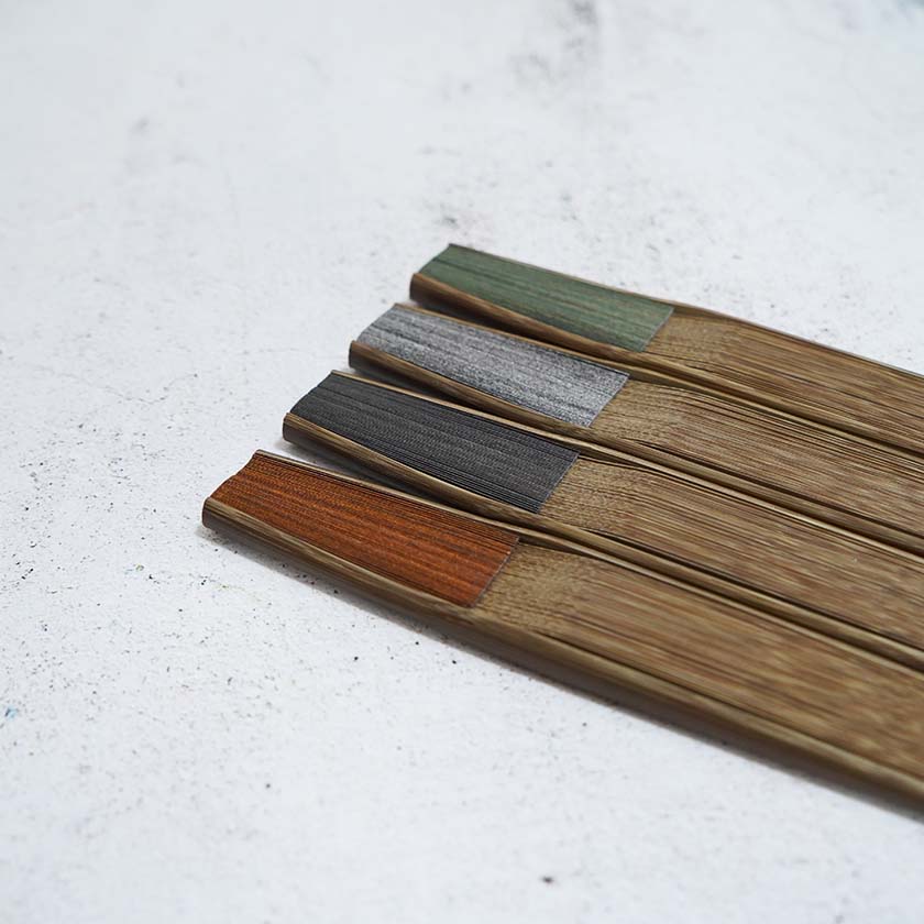 こちらの扇子は、銀箔を燻し変色する段階で出る上品な色合いの焼箔そのままの魅力を日本伝統の美意識「無常観」に重ね表現しています。独特の色味と風合いが美しい4色のカラー展開。染料を使わず銀箔の自然な色のみで構成されているにもかかわらず、これだけ色彩豊かなことにも驚きますね。