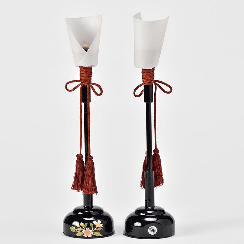 女雛は有職柄の正式な衣裳で、両脇の燭台(コードレス)で明かりを灯せば、寝殿のワンシーンを切り取ったかのような美しさ。