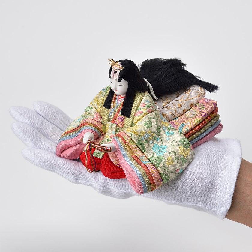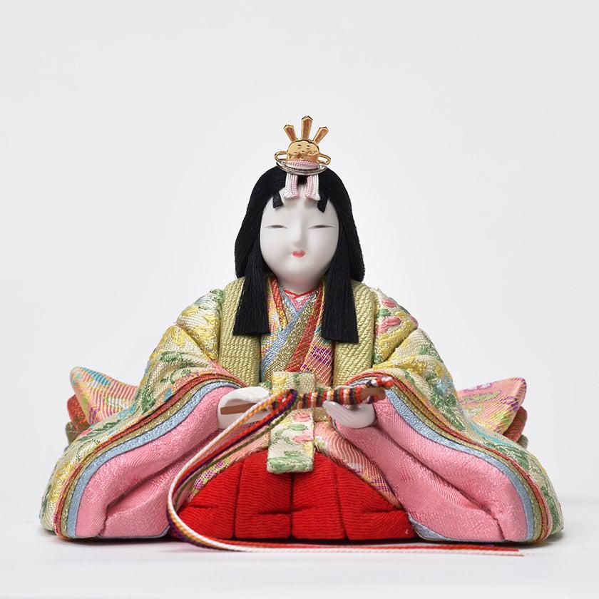 男雛の衣裳は落ち着いた色合い、女雛の衣裳は華やかな色合いで、互いの存在を引き立てます。お顔のタイプは大人顔。平安時代の姫君を思わせる、気品にあふれたお顔をしています。