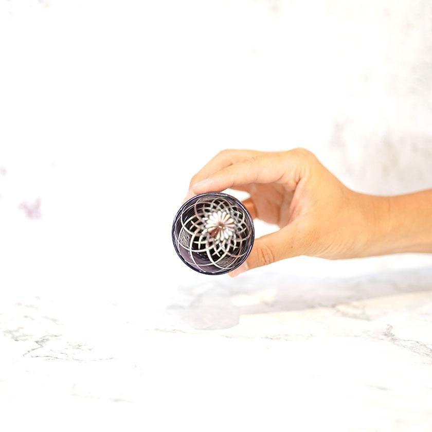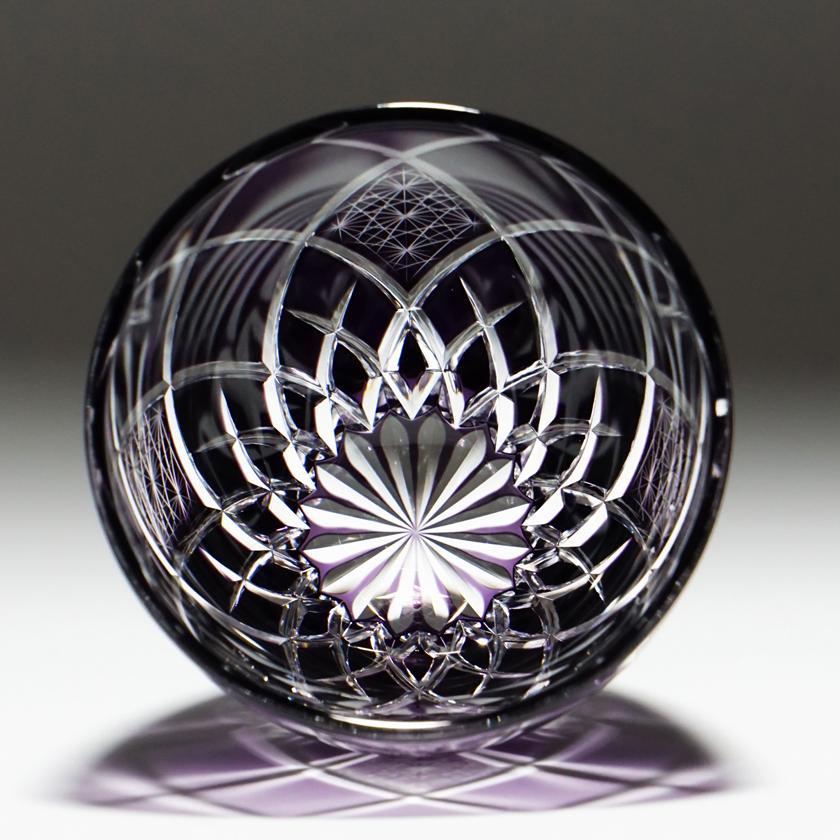 上から覗き込むと花のように見えるデザインに仕上がっており、液体を注ぐとカットの一つ一つが輝きます。