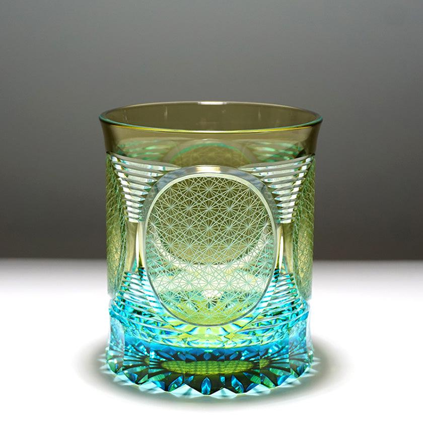 ブルーとイエローのグラデーションが美しい切子のロックグラス。硝子の輝きを左右する「磨き」の工程を、機械に頼らずすべて職人の手磨きで行うこだわり。切子によく使われる縁起のいい「菊つなぎ」の紋様がほどこされていますが、どこか洋風のようなモダンな印象もあるおしゃれな逸品です。