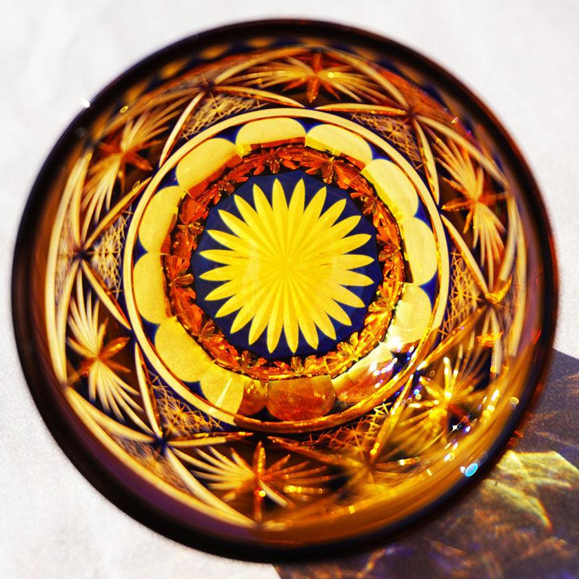 幻想的な瑠璃色とオレンジのグラスに、バランスよく施されたカッティングの美しさは、飲み物を入れるとより一層際立ちます。