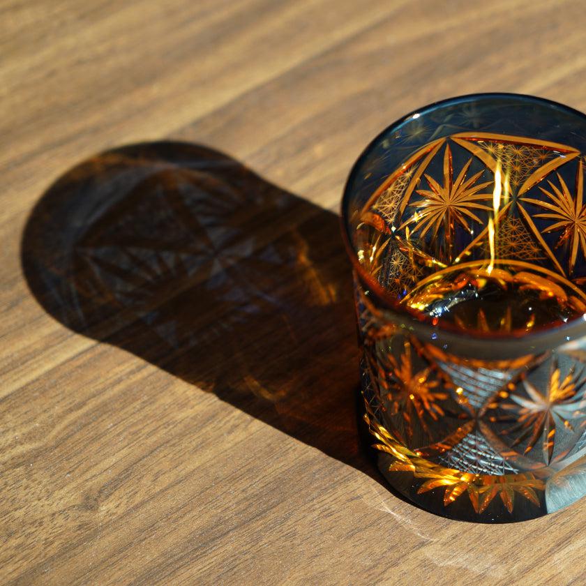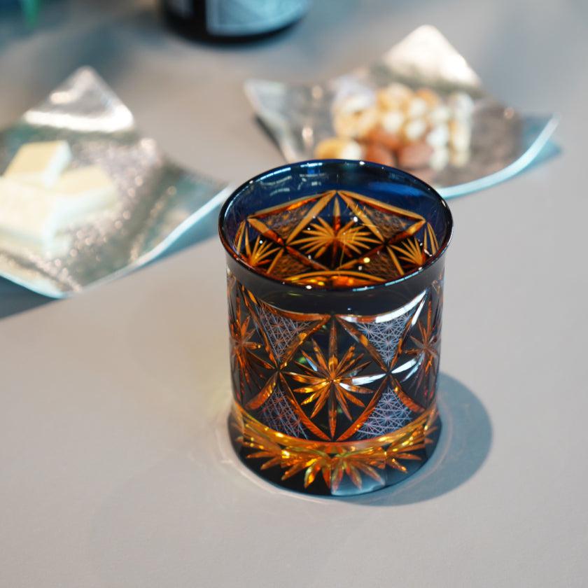幻想的な瑠璃色とオレンジのグラスに、バランスよく施されたカッティングの美しさは、飲み物を入れるとより一層際立ちます。
