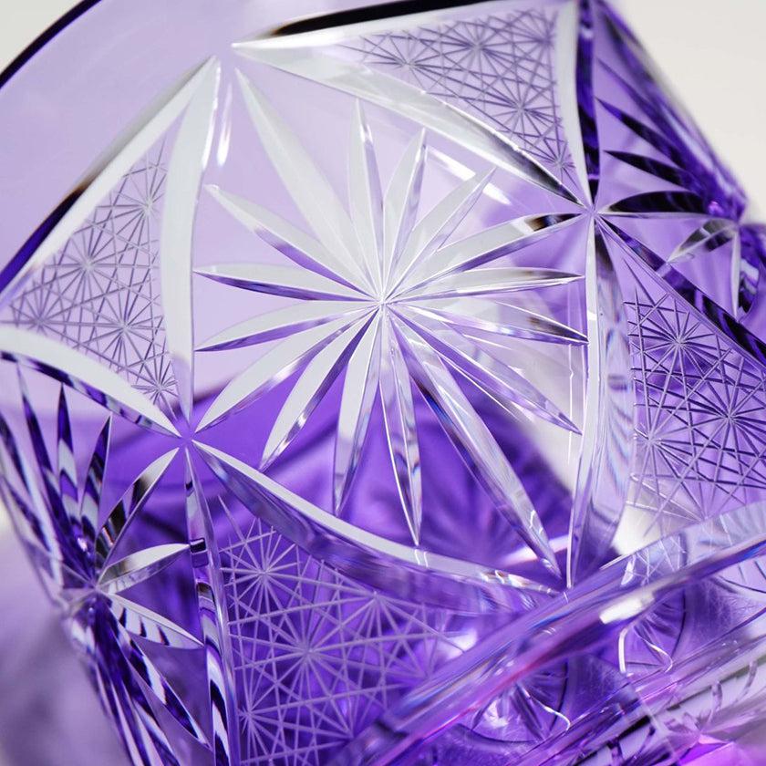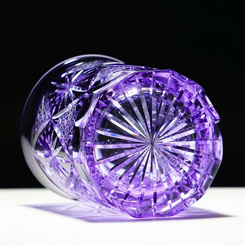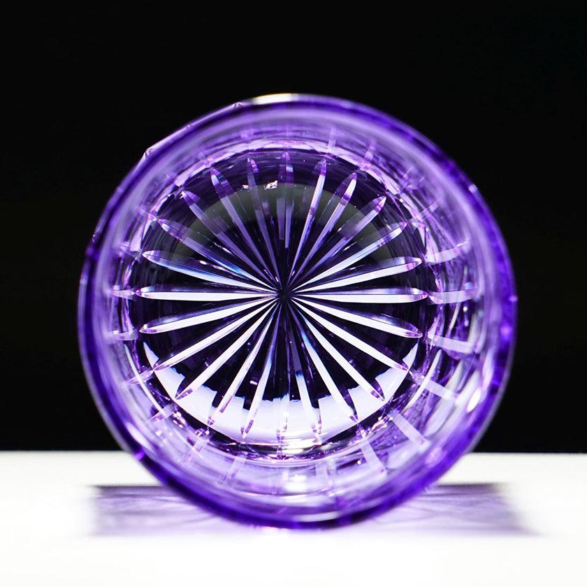 幻想的な紫色のグラスに、バランスよく施されたカッティングの美しさは、飲み物を入れるとより一層際立ちます。