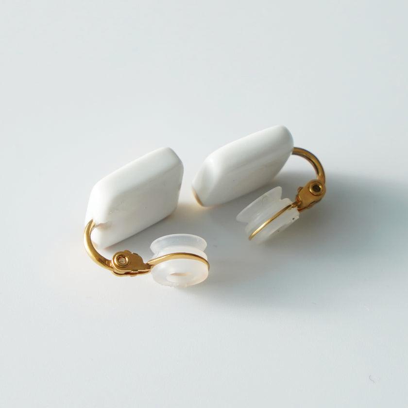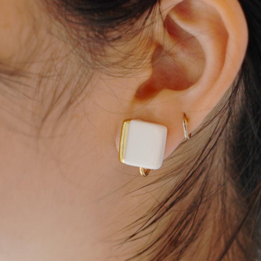 四角い純白の磁土に華やかなゴールドをあしらったイヤリングです。