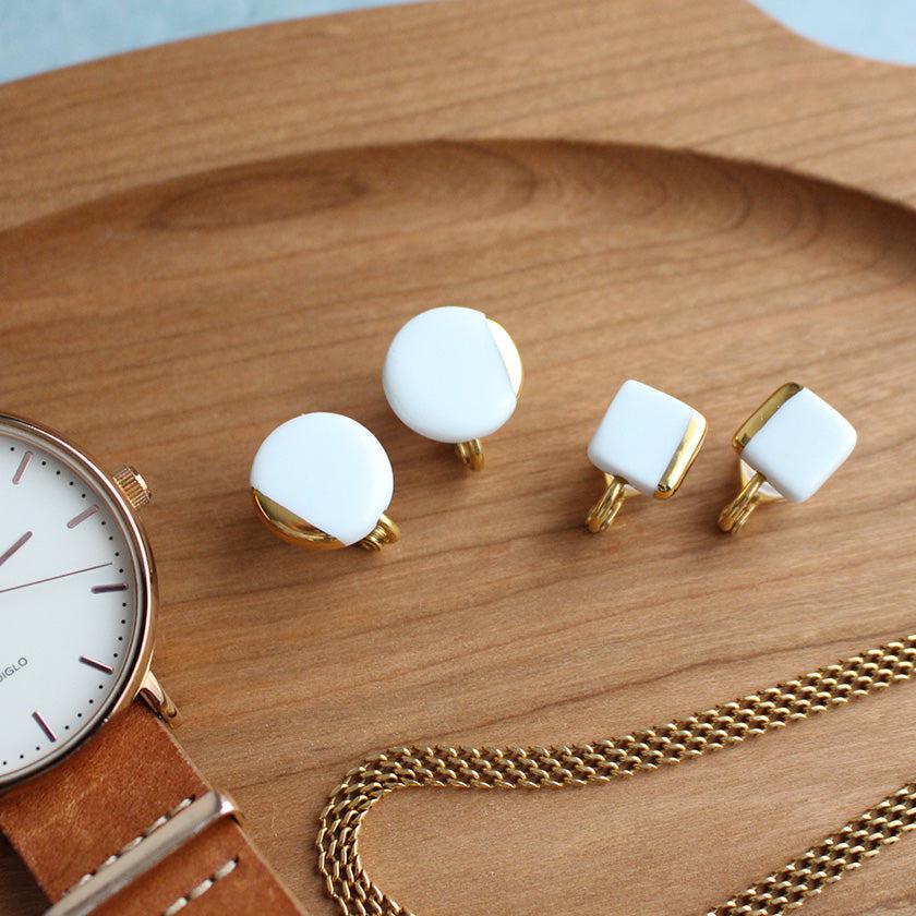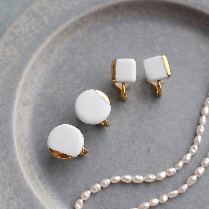 純白の白磁に、ゴールドが入ることで、耳に付けたときの肌馴染みもとてもよくなります。澄んだ白はどんなカラーの服装にもあわせやすいのも特徴。季節を問わずオールシーズン使えるのも嬉しいですね。